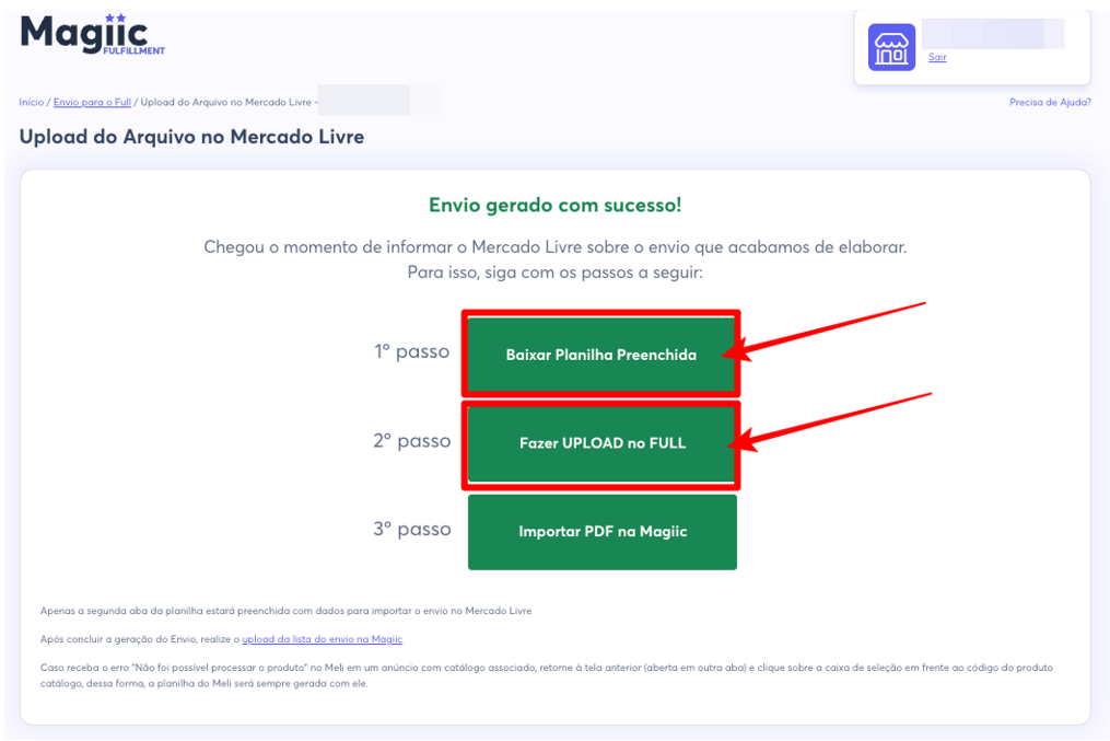 Após evoluir na tela do Mercado Livre, não esqueça de importar o PDF do envio de volta na tela da Magiic. No link abaixo você acessa o passo-a-passo do processo de importação do PDF:
