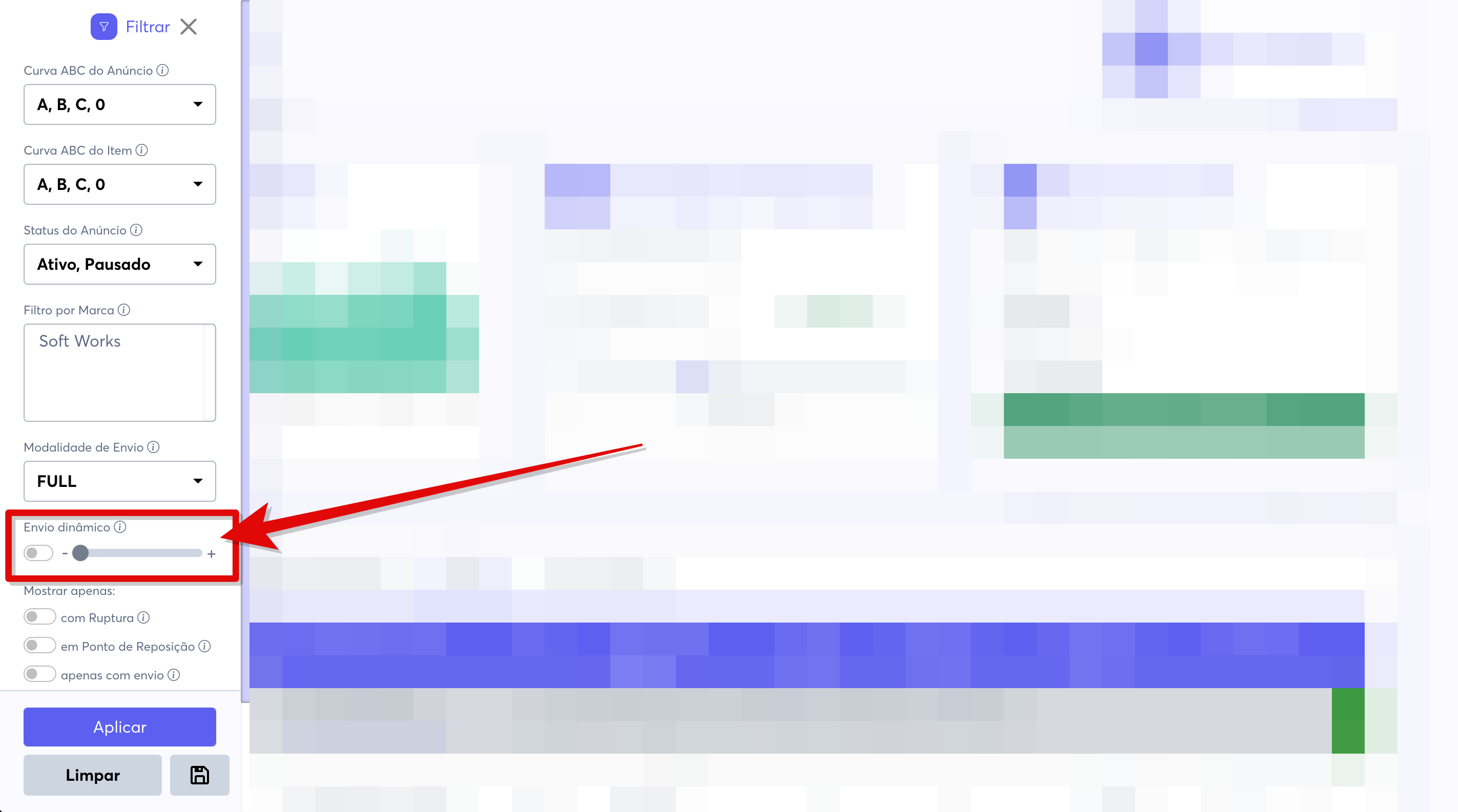 Após clicar no FAZER ENVIO FULL, já na tela de envios, acesse o menu lateral clicando em MAIS FILTROS ou no atalho no canto superior esquerdo da página: